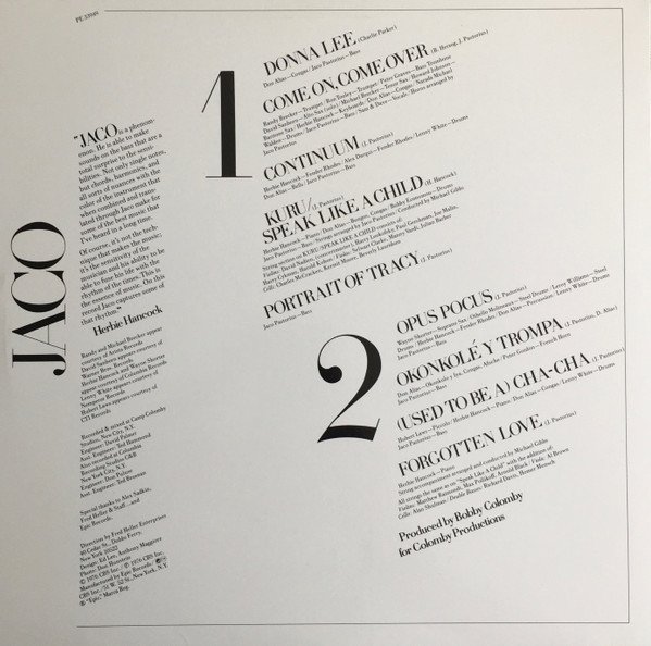 In terms of the tracking list, the album starts with “Donna Lee”, tackling the bebop warhorse is a statement in itself; Jaco turns the Charlie Parker (or Miles Davis) staple into a rapid, nervy bass/conga duet that announces both technique and taste. It’s flashy but tasteful: he can bop, he can swing, and he’s not afraid to let rhythm section colorations (Don Alias’ congas) recontextualize jazz tradition. “Come On, Come Over” then flips the record’s mood: Sam & Dave’s soul shouts over horn charts and Herbie’s clavinet, and Jaco locks a pocket that proves his sense of groove is as deep as his melodic daring. “Continuum” is where his lyrical side blooms — a less flashy, more songlike piece led by Rhodes lines and a patient drum feel, giving the fretless bass room to sing long, glassy notes and little moving countermelodies; here the instrument behaves like a human voice, and Jaco composes like a miniaturist, each phrase perfectly placed. These early tracks show his twofold intelligence: the ability to dazzle, and the taste to know when to be simple.
